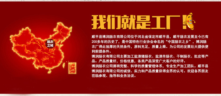 順平縣博潤腸衣有限公司位于河北省保定市順平縣,順平腸衣發(fā)展至今已有200多年的歷史了,是中國特色行業(yè)協(xié)會命名的“中國腸衣之鄉(xiāng)”,博潤腸衣廠得此獨厚的天然條件,原料充足,質(zhì)量上乘。為公司的發(fā)展壯大提供便利前提條件。
