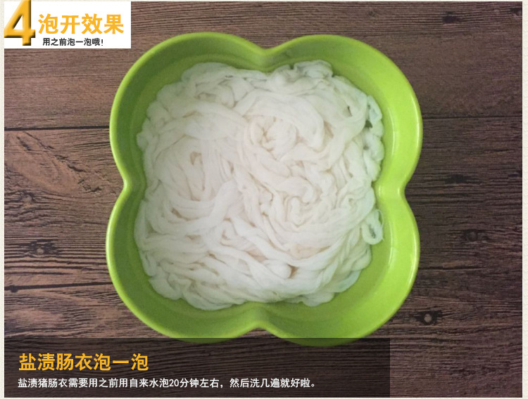 1.鹽漬豬腸衣用冷水(冬天可用溫水)浸泡半小時,再用清水反復多沖洗幾遍,就可使用(直到?jīng)]有鹽味為止,將鹽洗凈腸衣有韌性,不易破)。